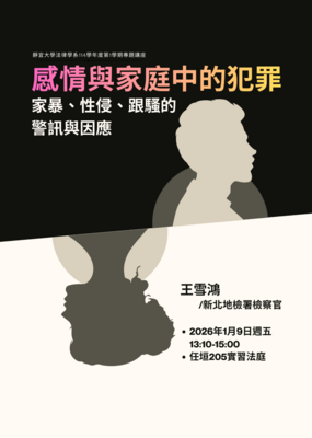 【法律學系專題演講】感情與家庭中的犯罪:家暴、性侵、跟騷的警訊與因應